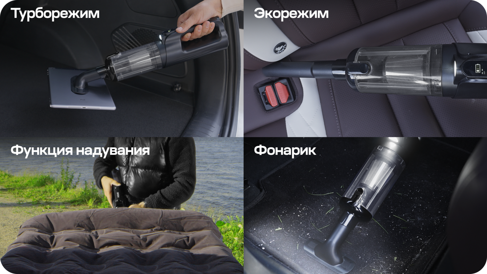 - встроенный фонарик. Автомобильный пылесос с заряженным аккумулятором поможет осветить дорогу в сложной ситуации или тщательнее вычистить салон ночью при плохом освещении.